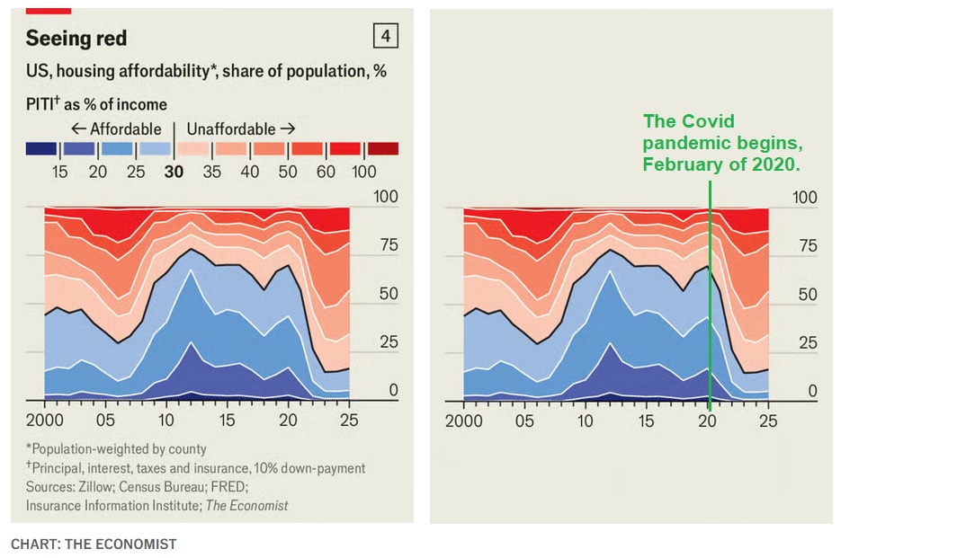 The image on the left was provided by The Economist magazine.   I modified the one on the right to identify the beginning date of the pandemic.    Yes, your eyes do not deceive you:  housing affordability plummeted soon after the pandemic began.   No, its not because interest rates shot up – that didn’t begin for 2 more years, March of 2022.    Clearly, when rates jump, mortgage payments do the same.