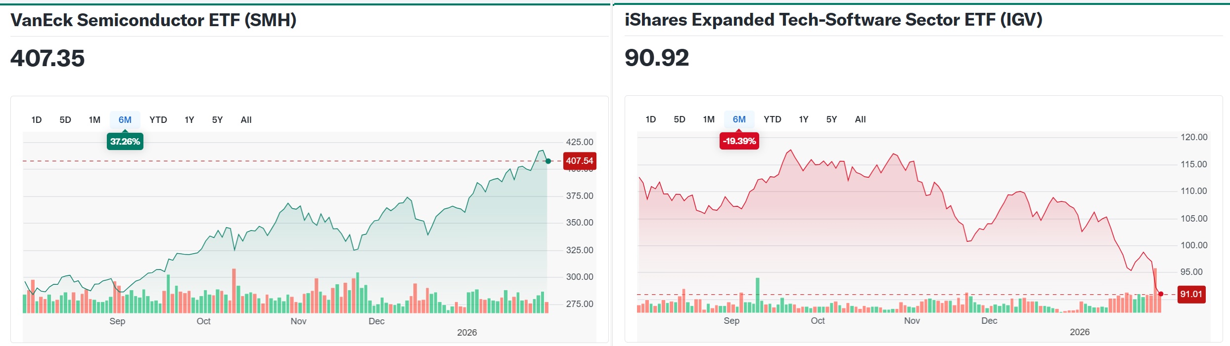 The chart on the right shows just how much this narrative has changed. In the past 6 months, the value of an ETF known and the “IGV” — a collection of publicly traded SaaS companies — has fallen by almost 20%. Historically, this is unusual. In 2024, that SaaS index was up more than 23%. In 2023, it was up by more than 58%. But by 2025, the proverbial bloom was off the rose, so to speak, and this EFT finished 2025 up by only 5%. And this year, the performance is much more ugly.