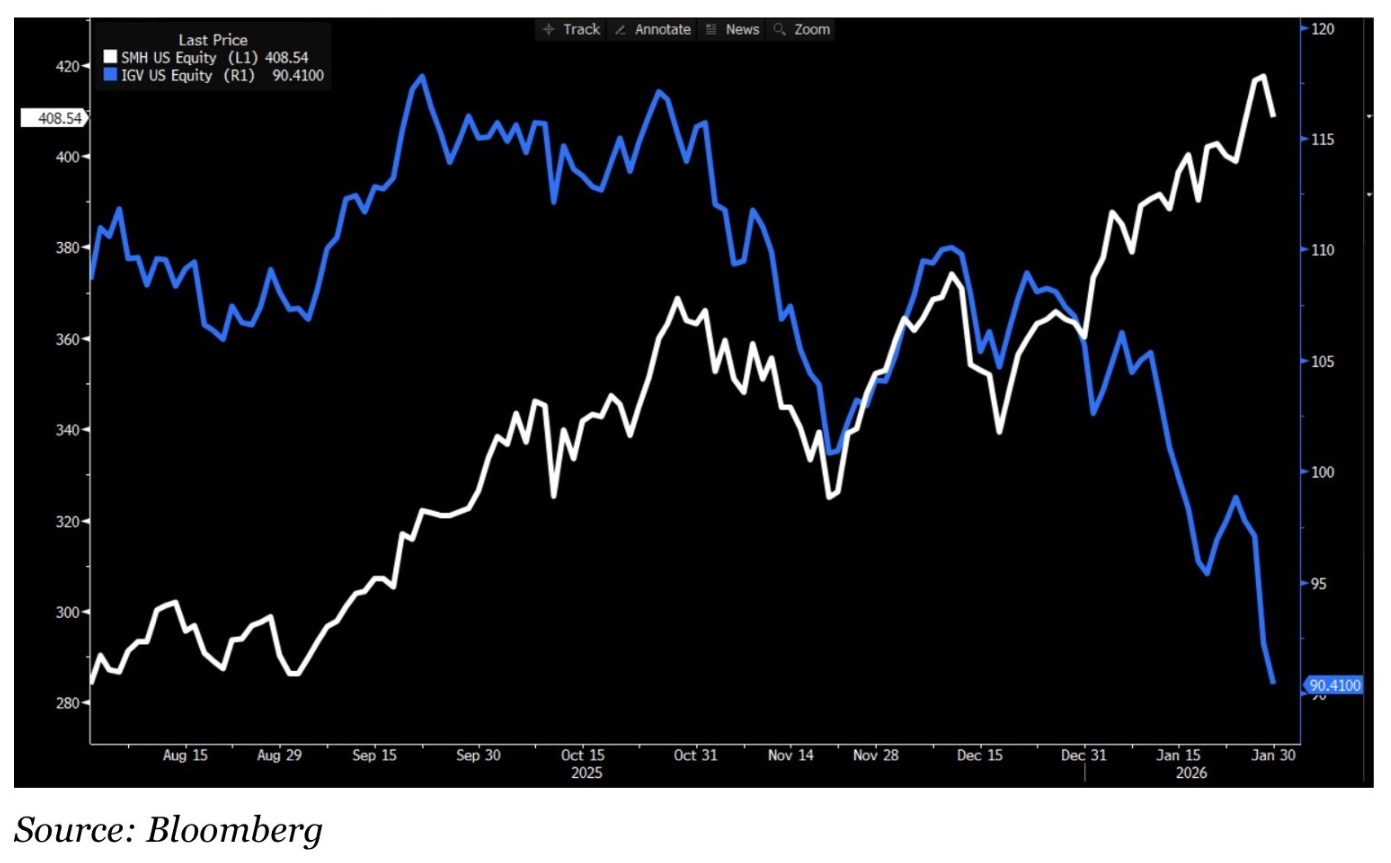 And so was the directional relationship between the chip companies and the SaaS companies. Up until a few years ago, both market segments tended to move together. If microprocessor company stocks went up, so did SaaS company stock values. Both were viewed as “high-growth tech” companies. But in the past couple of years, that relationship seems to have broken down. Initially, to my eyes, the divergence seemed to be related to spending or capital choices — a type of “crowding out.” In other words, outsized spending on AI infrastructure (read: chips) inherently restricts spending elsewhere. Software “seats” likely took a hit.