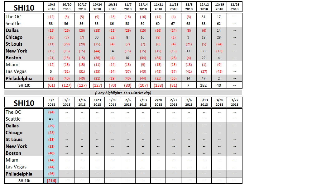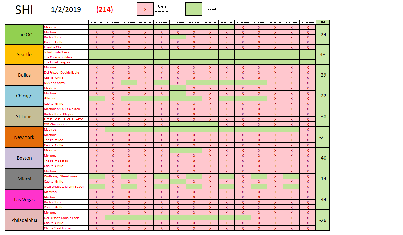 Clearly not so hot, when compared to the Dec 19 SHI10 reading. But that’s not surprising. Our first SHI10 reading, taken on January 3, 2018, was also quite weak: A negative 219. Almost identical. December is apparently a great month to operate an expensive steakhouse. January, clearly, is not. Here is the weekly survey: