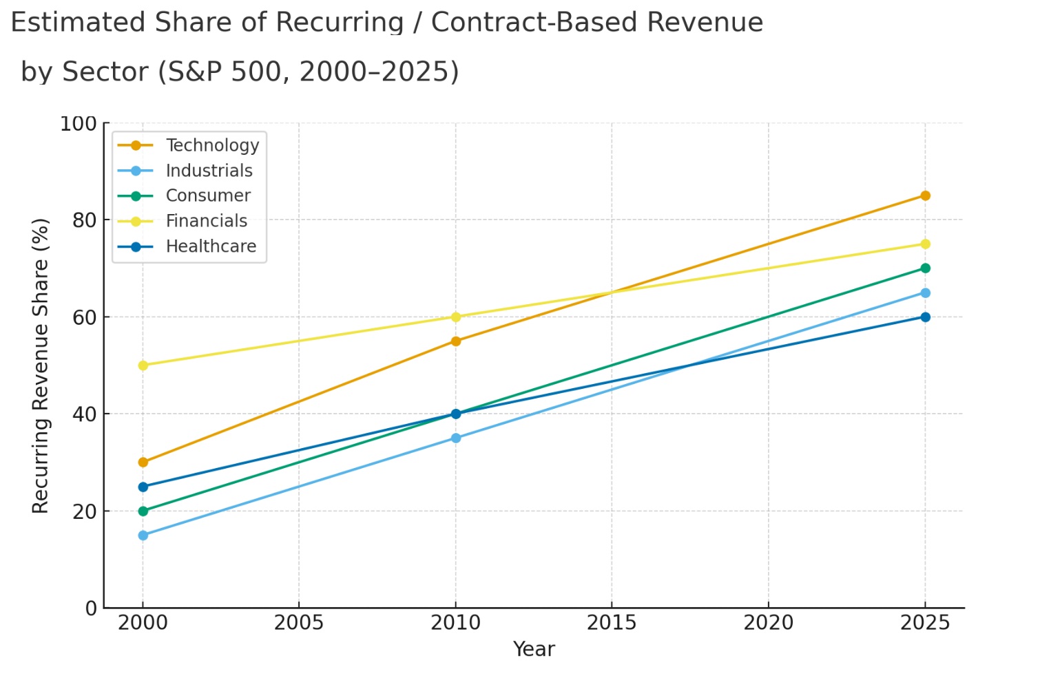 <> Technology has surged from ~30 % to ~85 %, driven by the SaaS and cloud shift.