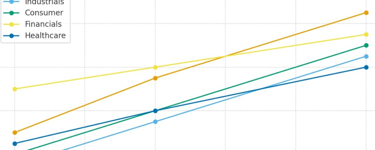 <> Technology has surged from ~30 % to ~85 %, driven by the SaaS and cloud shift.