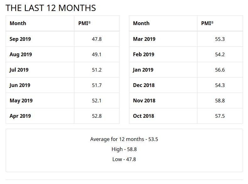 The stock markets are unhappy this week.   The weight of negative economic news is clearly growing with each passing day, and the October 1st ‘Purchasing Managers’ Index’ — or PMI — tabulated by the Institute for Supply Management (ISM), showed increasing manufacturing weakness.   An index reading of “50” is considered neutral, neither expansive or contracting, and we’re now at 47.3, down 1.3 points from last month’s reading.   The ISM has been producing this report since 1948, so they likely have the bugs out of the survey by now.    Of the 18 industries they survey monthly, 15 of them experienced a contraction in September.   For context, here a chart showing the PMI readings for last 12 months: