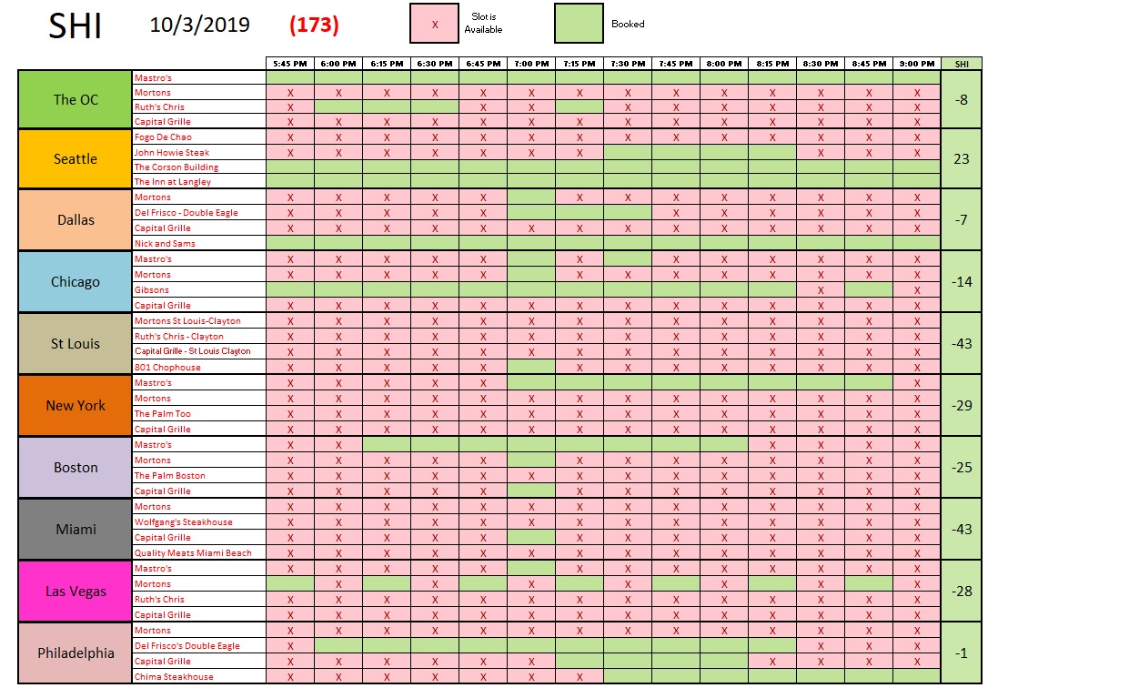 As this is a new calendar quarter, I’ve included Q3 and this first entry in Q4 on the trend chart.  Big picture:  Reservation demand at our extravagant steakhouses is lukewarm at best, much like the center of a ‘rare’ Filet Mignon.    Either our well-heeled consumers with deep pockets and a hankering for a beautifully prepared steak are sharing the same feeling the manufacturing folks have, or the report on the health effects of steak hasn’t yet fully circulated across the internet.  🙂