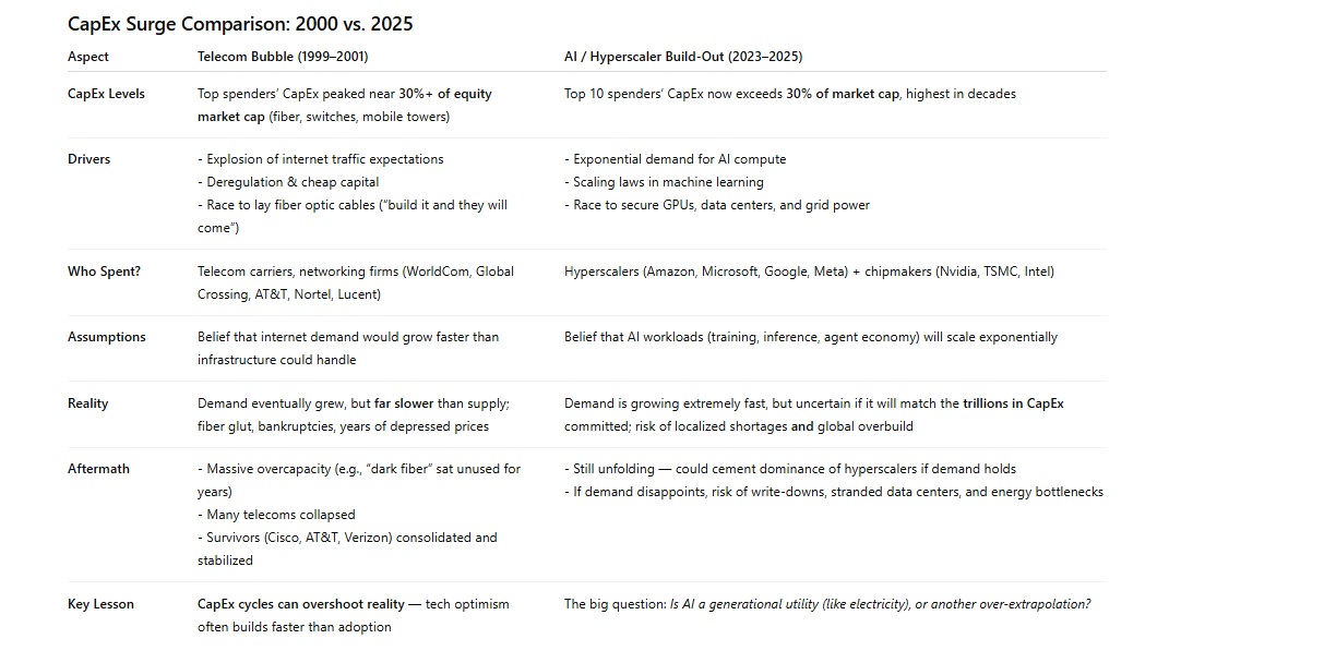 To the “Is this a bubble?” question … the last time we say an explosion in CapEx similar in magnitude was, in fact, in the late 1990s.   Yep.  The Dot-Com bubble.  That was clearly a bubble.   We know because it popped.   Badly.   It’s worth noting that this 2025 CapEx boom is even larger.