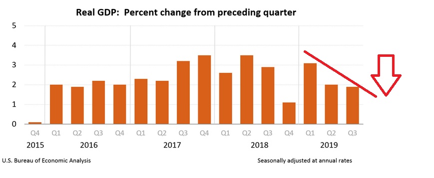 Look at the chart.  US GDP growth is clearly decelerating.  After tipping the scales at a robust 3.1% annual rate in Q1, Q2 and Q3 are telling a very different story.  You’ll recall the Q2 GDP growth rate was 2.0%.   Today’s ‘advance’ estimate of the Q3 growth rate is slightly lower — at the annualized rate of 1.9%.  The facts seem incontrovertible:  The trade war appears to have taken about 1% off our annual GDP growth rate.  Looking at the graph, one has to wonder if the trend will continue.   Will GDP growth continue to decline?  Are we heading to that “bad place” where our economy begins to contract?  That place known as a recession?