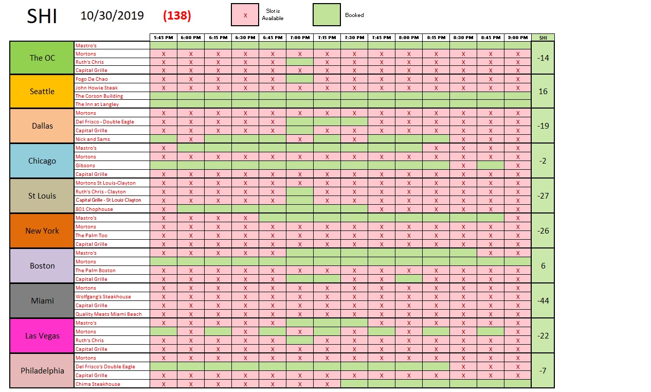 So so.   Not as well as the past two weeks, but not bad.  Once again, the SHI10 reflects a lower overall demand for high-priced steaks at America’s most expensive steakhouses when compared to historic metrics.   Again, remember, this is not bad.  But it is very much in alignment with today’s GDP number.   Luke warm.   Like a well-prepared ‘rare’ Filet Mignon.  Here are today’s numbers: