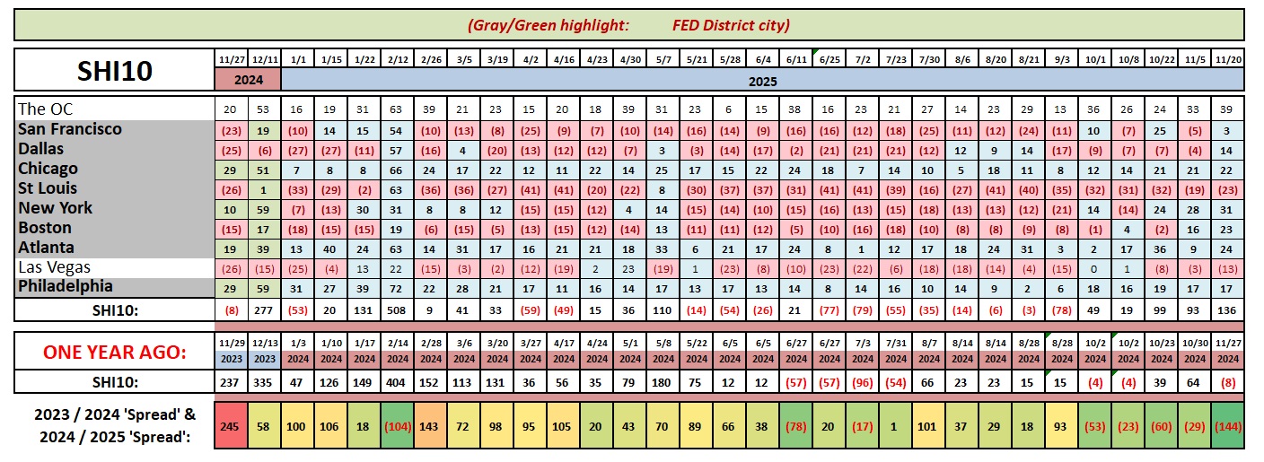 Interesting!    We have an SHI40 firmly in the black.   Only two of our 10 markets reflect negative demand numbers.   This is quite a departure from the trend.   Take a look: