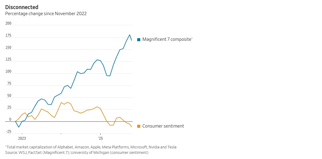 Perhaps.   While I appreciate his chart, I’m not convinced there’s a high degree of correlation between the two metrics.  I would argue consumer sentiment is highly correlated to inflated costs of living; while, alternatively, the ‘Mag 7’ enterprise values only loosely impact the average consumer.  On the other hand, when a newly built data center down the street opens up and simultaneously neighborhood electric utility bills rise, that overlap is where the two metrics align.   And not in a good way.