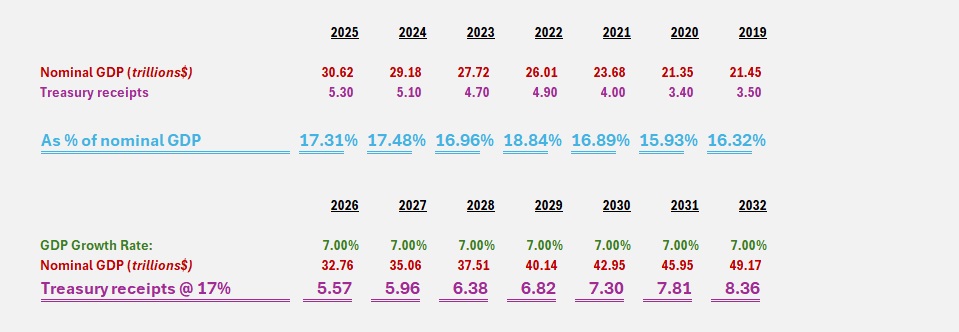 In this scenario, total collections would increase to $7.3 trillion by 2030. Do you remember that FY2025 spending totaled just over $7 trillion? If spending were held constant for the next 5 years, and GDP grew annually at the rate of 7%, the US would be in a surplus by 2030! 🙂