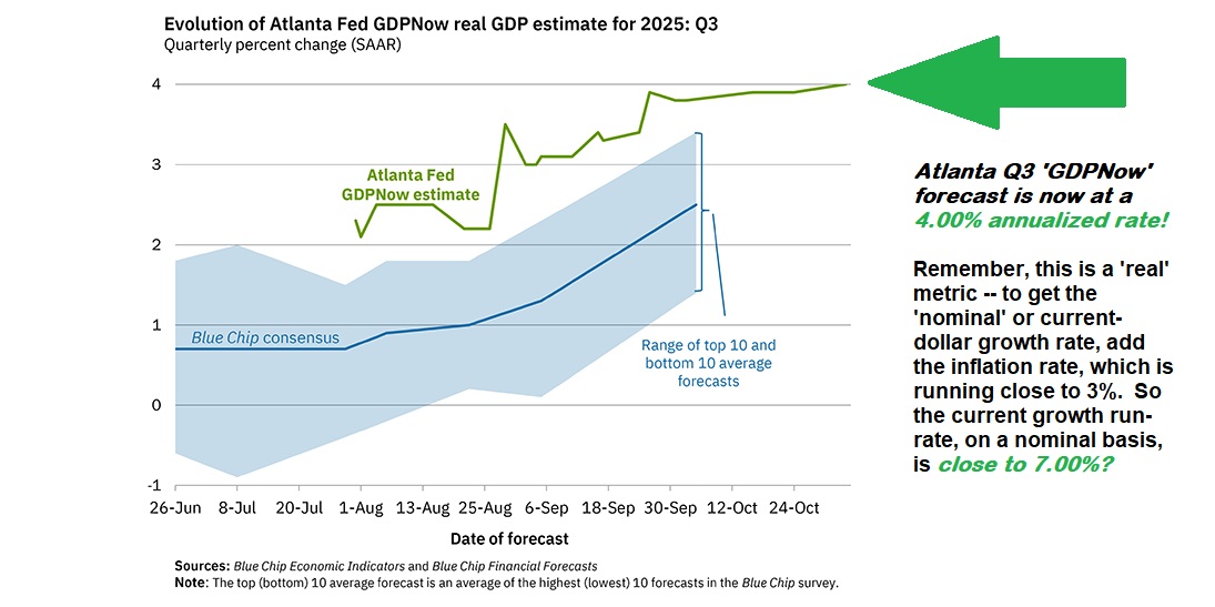 While current GDP forecasts are all over the map, the Atlanta FED believes Q3 GDP will clock in at the annualized rate of 4.00%:
