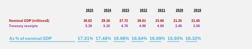 First, it turns out that annual US Treasury collections equal about 17% of the US nominal GDP each and every year. Of course, it varies each year, up and down, depending on tax rates and other factors, but over long periods it has averaged around that figure. Here’s a chart showing the actual collection rates for recent years: