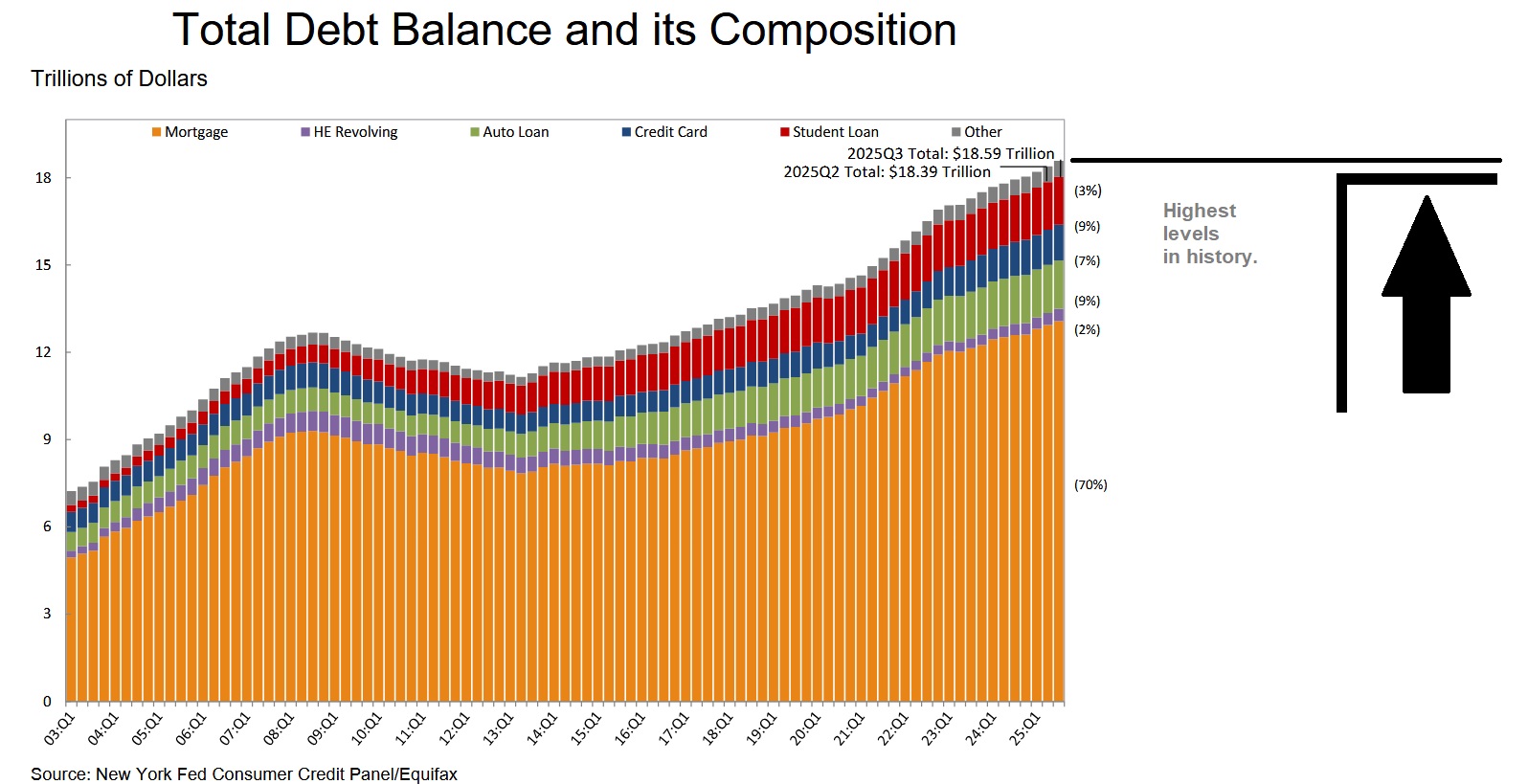 Other balances, which include retail cards and consumer finance loans, rose by $10 billion and now total $550 billion. Student loan balances rose by $15 billion and now stand at $1.65 trillion. In total, non-housing balances increased by $49 billion, a 1.0% increase from 2025Q2.
