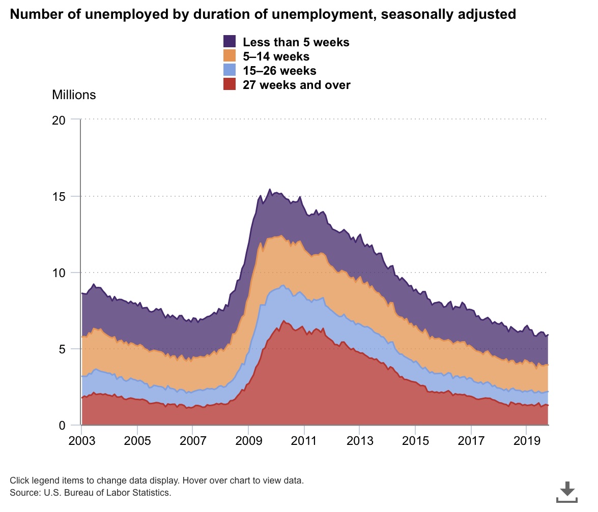 The number of employed folks has never been higher. Right now, 158.5 million people are employed in the US. Out of a total ‘civilian labor force’ of about 164.3 million. Most of those currently unemployed, looking for a job, have not been unemployed for long: