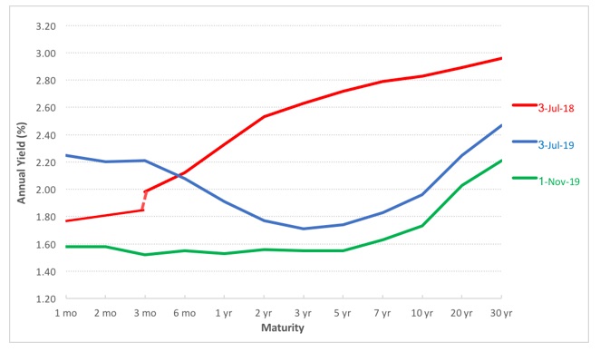The ‘green‘ line — the curve as of November 1st — is nicely positive! Compared to the ‘blue‘ line — from just a few months ago — we see significant improvement. The FEDs choice to lower rates at the short end of the curve (left end) has helped lift the long end of the curve (the right side) up as well … resulting in a curve with nice slope. No inversion here, folks. The FED fixed the inversion. This cylinder is firing just fine!