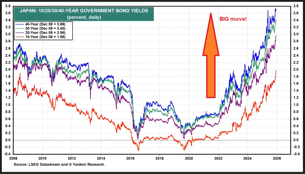 Interest rates in Japan are skyrocketing! Thru the lens of their prior levels, of course. For 2 or 3 decades, the rates on Japanese long-term debt was close to zero. No longer. The reasons are lengthy and complex, having to do with foreign exchange rates, inflation, maintaining the value of the yen, and a host of others — the least of which is the fact that Japan’s debt to GDP ratio has, for years, exceeded 200%.