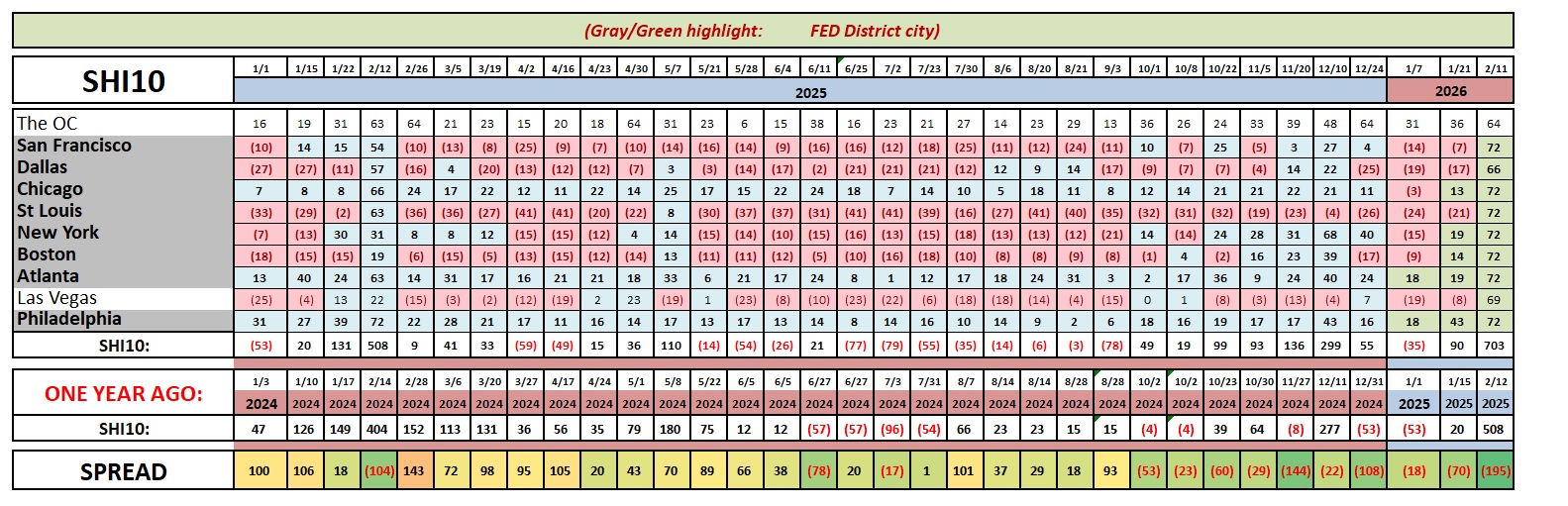 We haven’t seen a week where each of the 10 SHI cities were “in the black” in quite a while.  Unsurprising, the last time was the SHI40 on 2/12/25.    On that day, the SHI40 clocked in at 508 — a super high reading.   But this year, our young lovers have gone over the top.  The steakhouses are booked.   Can I suggest Costco?   They have both excellent wines and beautiful steaks.   Yes, it’s a do-it-your-self kind of thing, but I think that’s as good as you’ll do this weekend.   Unless you have already booked your expensive eatery.   🙂