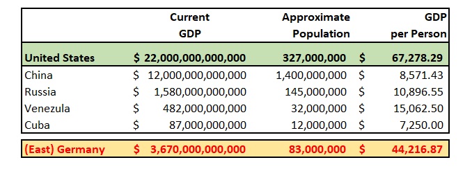 The numbers on the chart are factual. In some cases, they may be a bit dated — for example, the Cuba numbers are about 5 years old — but the conclusions are irrefutable. The “per capita” income in socialist (or communist) countries is far lower than the per-person average income in the United States … or Germany.