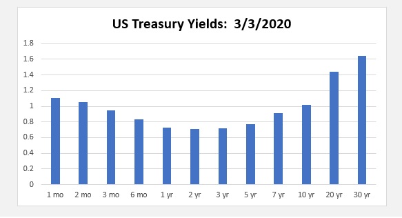 The 2-year Treasury was paying about 0.71% yesterday, compared to 1.11% for the 1-month and 1.64% for the 30-year. The 3-month and 10-year are almost identical. So, I’m sure you’re asking, what does this mean?