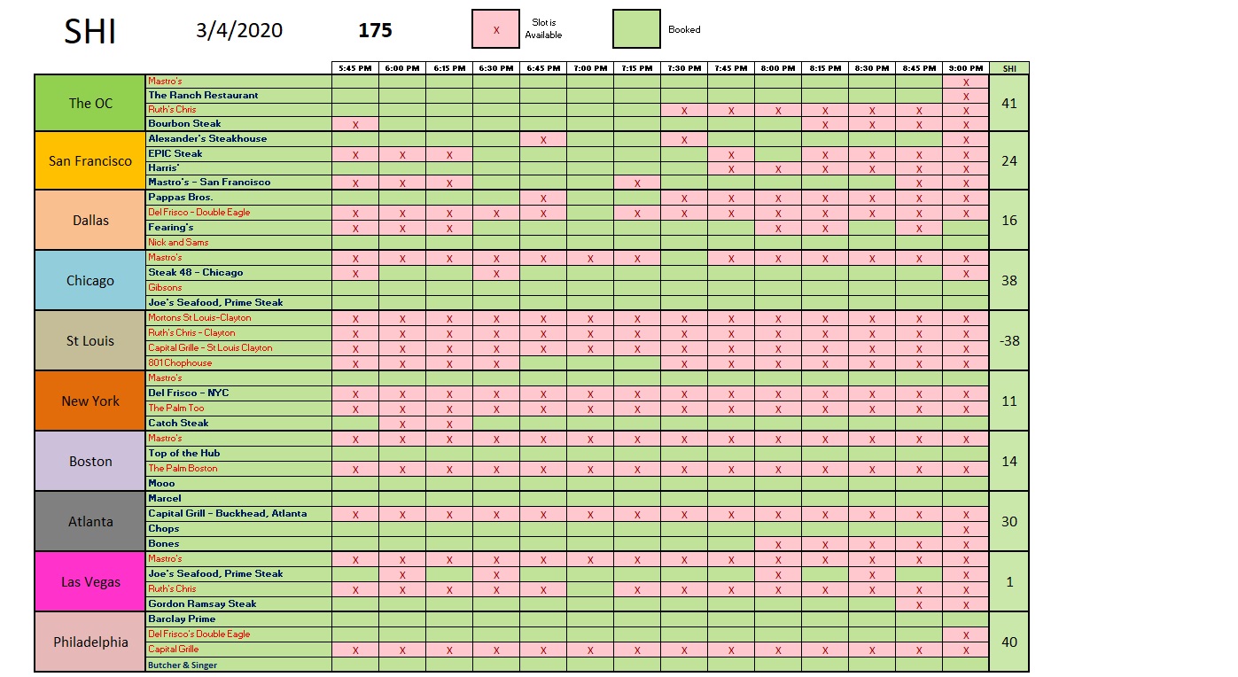 Nope. Not a dent, that I can see. In fact, most of our SHI10 markets show stronger reservation demand than last week. The biggest negative change is in St Louis, but this city has been trending poorly for weeks now. I don’t think virus fears have any impact on these results. Expensive steaks are in very high demand in the OC, San Francisco, Dallas, Chicago, Atlanta and Philly. Well-heeled diners, at tables of 4, seem more concerned with finding the perfectly grilled steak than catching the virus. Interesting. Here are the trend numbers:
