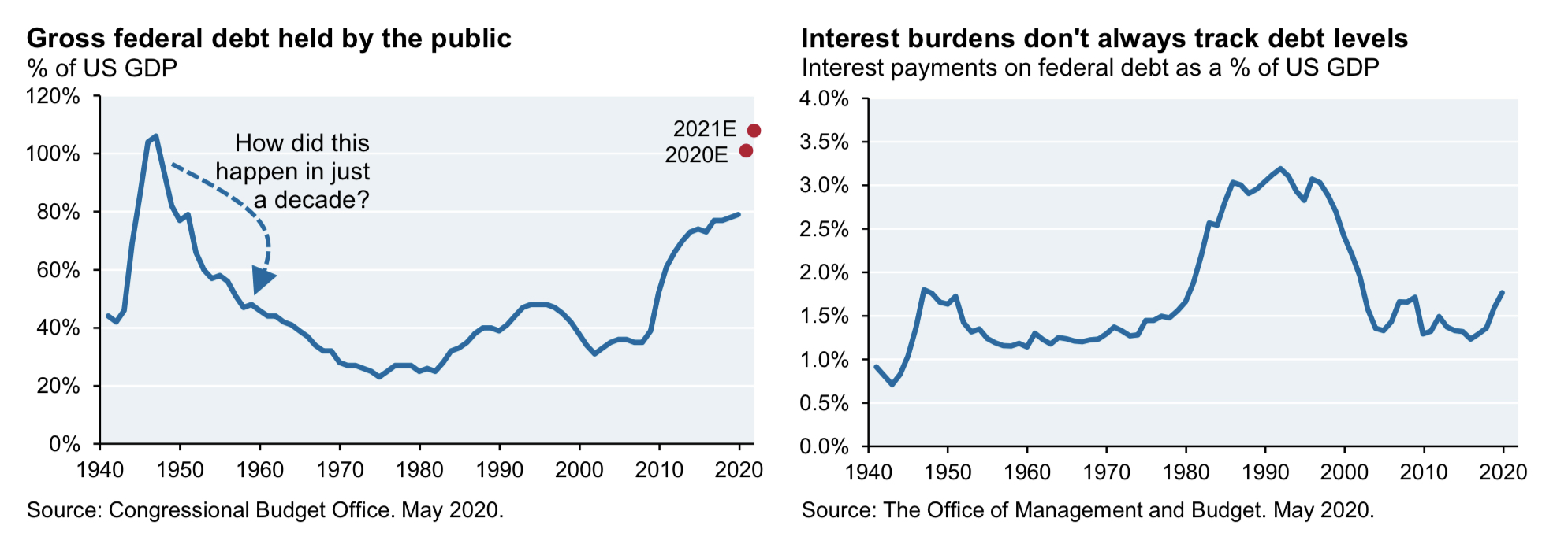 The simple answer is yes. Of course, proponents of ‘Modern Monetary Theory’ would tell you the answer is always yes regardless of the size of the mountain. You all know I’m not a fan of MMT, so I don’t agree with their conclusions. But even from my perspective, under current conditions, I believe the US can easily afford to carry our debt load. Which is a good thing because the US Treasury plans to sell a boat-load of new debt this year. You’ll recall I mentioned the US Treasury sold $20 billion of “20-year” Treasury bonds last week, something they had not done since 1986. The multiple-trillion dollar stimulus programs, both passed and planned, are expected to add trillions more to our national debt load.