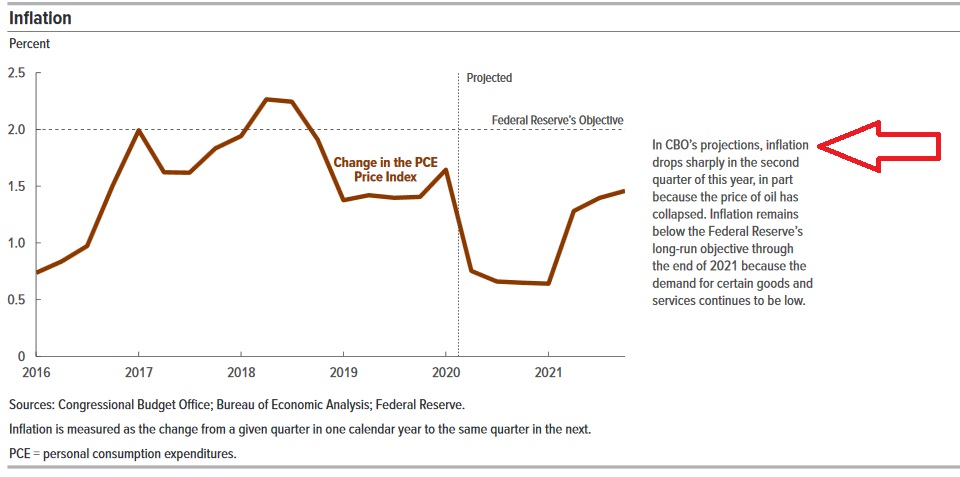 The FEDs other nemesis is inflation. Or, in this case, ‘negative‘ inflation. The growth in money supply notwithstanding (a different discussion), the FED is concerned deflation may rear its ugly head once again. The CBO offered this inflation forecast, once again with the FEDs assistance: