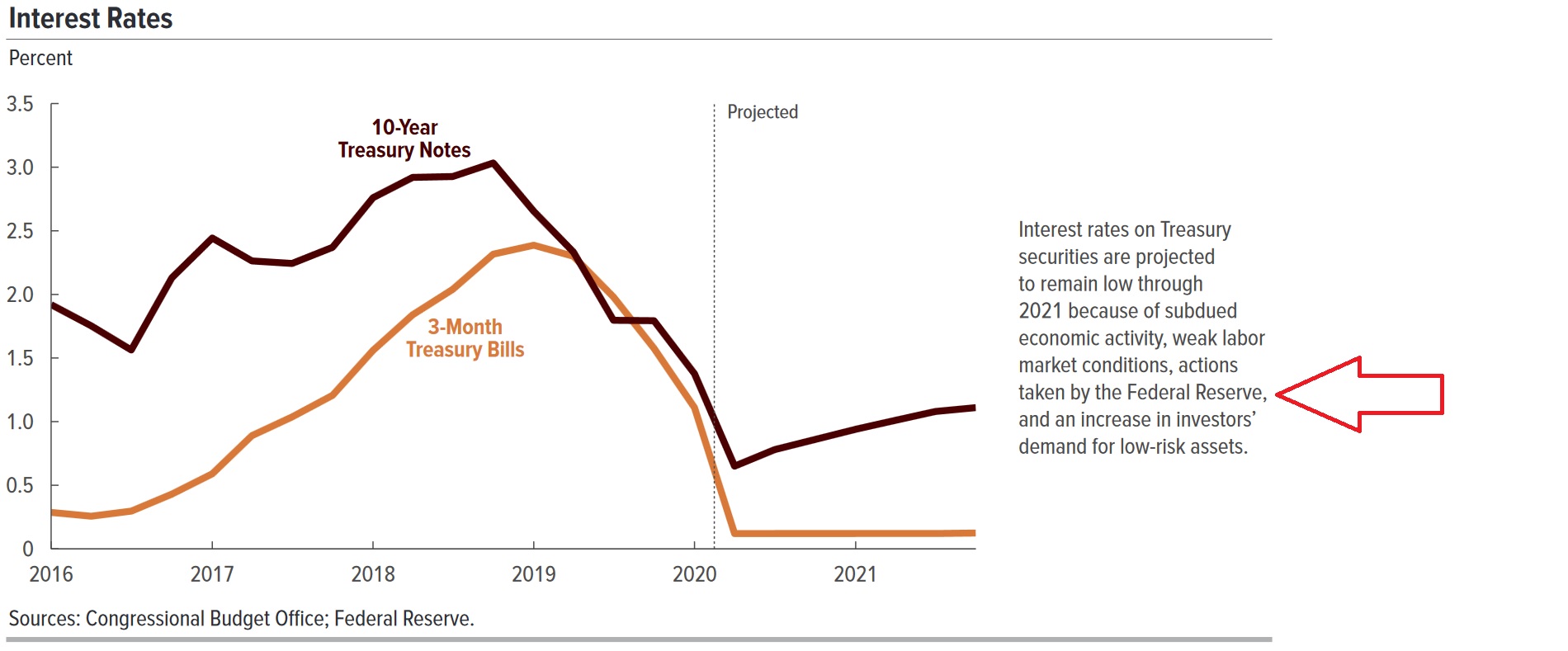 Over the long run, there is only way to achieve both outcomes. The FED must remain ready and willing to buy whatever amount of Treasury securities it must buy to stabilize both the market and interest rates. I’ll talk more about this below. But now, take a look at this ‘Congressional Budget Office’ (CBO) rate forecast based on FED data: