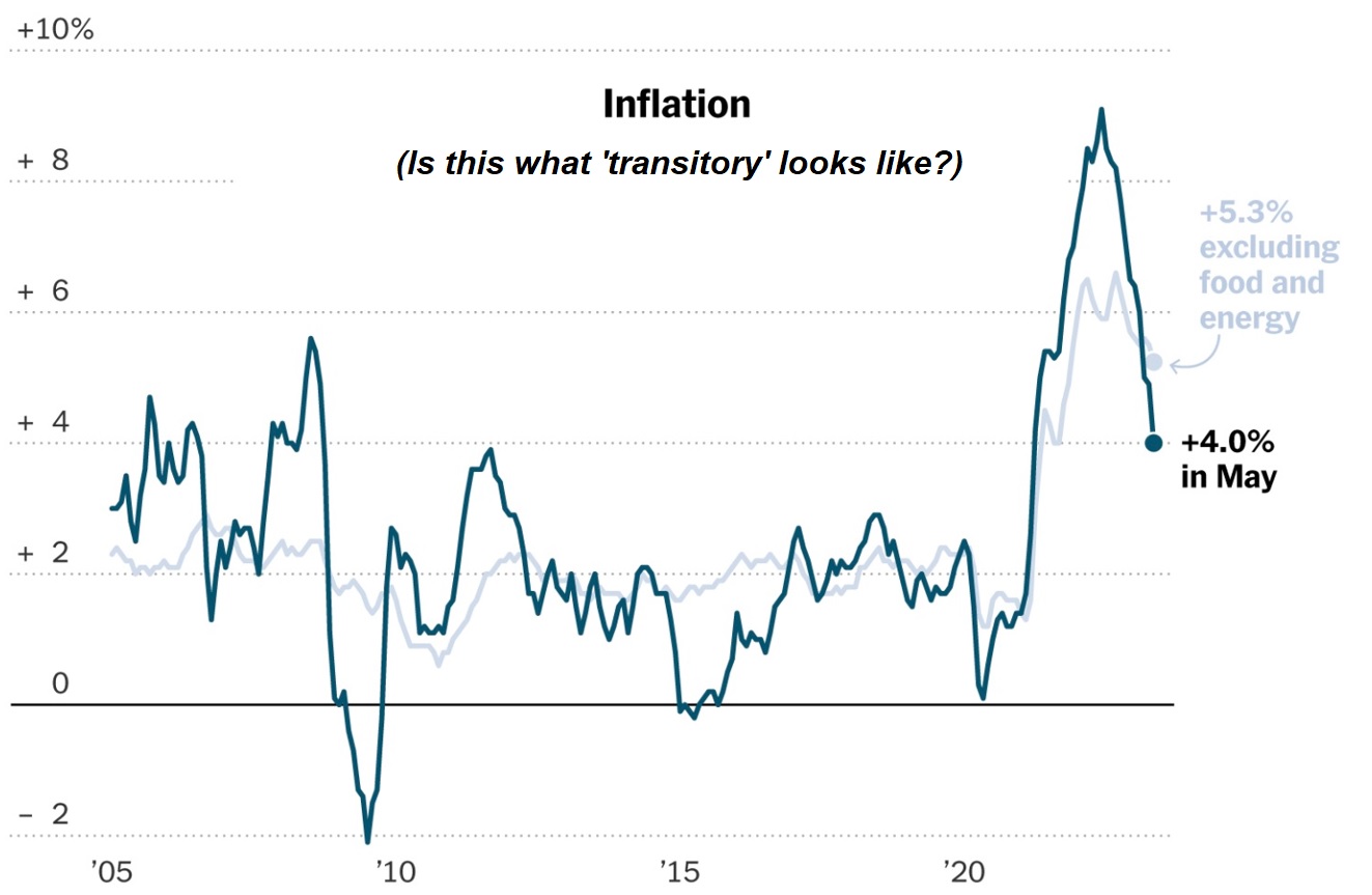 The chart above reminds me of the Himalayas, home of 9 of the 10 world’s highest peaks. That post-pandemic spike — almost straight up and then equally straight down — looks transitory to me. And as “housing” numbers moderate in the next few months, I expect this trend to continue. Sure, the ‘core’ inflation rate remains elevated — perhaps even sticky — but unlike the FED voting members I believe this, too, will moderate in coming months.