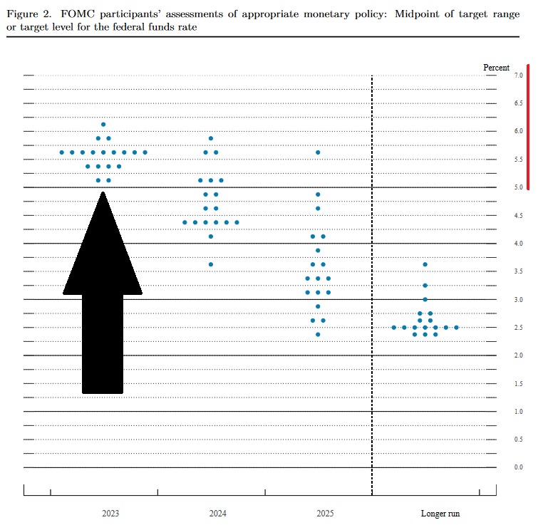 I know the image above my added black arrow looks like a cute little spaceship, but those 18 dots are actually individual voting member future rate forecasts. Like me, only two expect rates to remain static for the rest of 2023. At the other end of the spectrum, two voting members believe the FED funds rate will be closer to 6% by year end … and one believes it will exceed 6%!