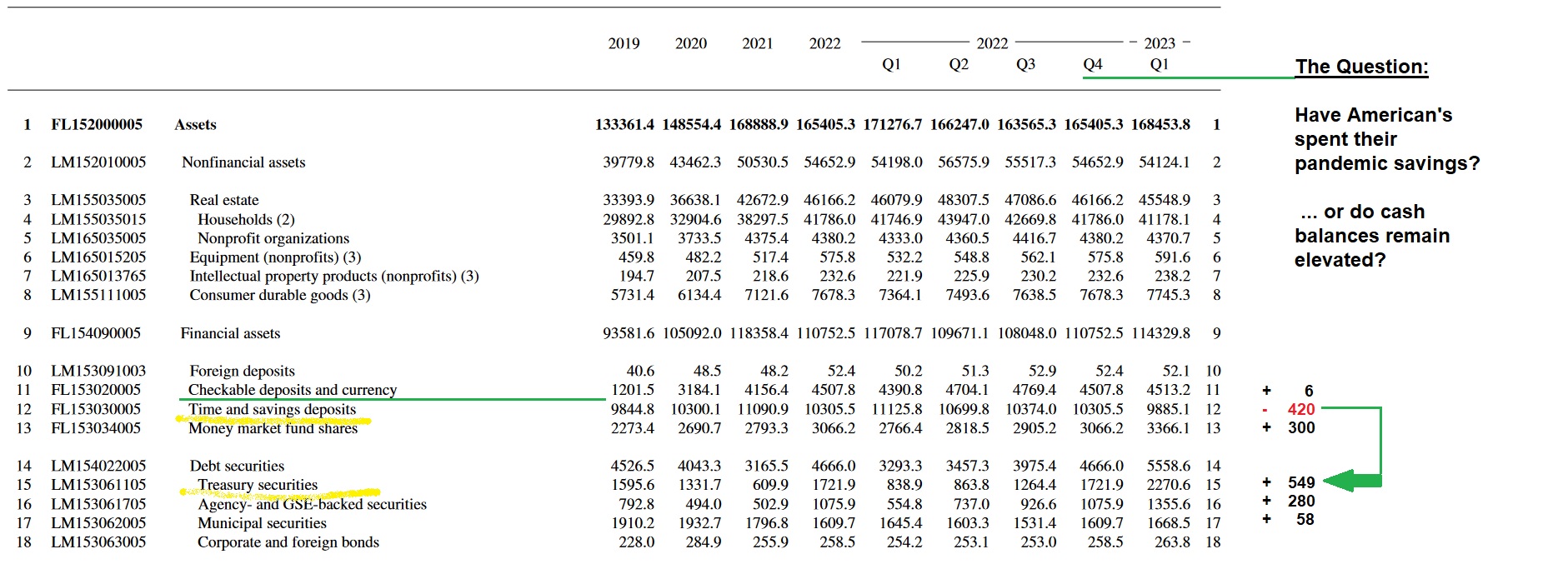 This is the aggregate balance sheet for all Americans. Have they spent all their pandemic savings yet? Nope. Trust the data … not the hype from the media. The data is clear: Pre-pandemic, Americans in the aggregate had saved about $3.2 trillion (line 11 above.) Post-pandemic, after both Republican and Democrat administrations alike handed out trillions in federal stimulus, savings swelled to almost $4.8 trillion in Q3 of 2022. Today’s number remains very near that level. Americans are flush with cash. In fact, if we include ‘longer term’ deposits in the mix, Americans actually have more cash than they did back in 2022!