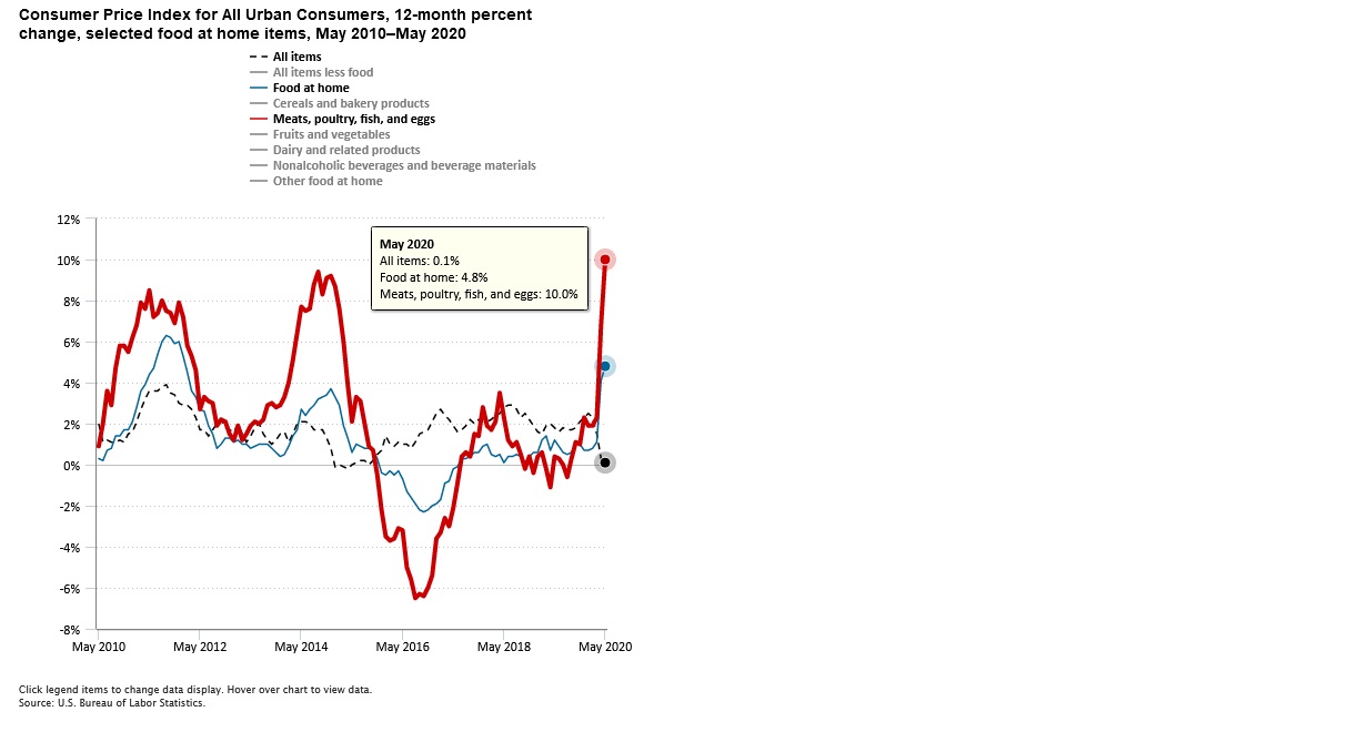Supply has been curtailed by processing plant closures, the result of CV-19 spreading within their walls. We’ve seen processing plant closures across the US, helping push the beef index to all-time highs. Both increased demand and supply constraints have caused prices to rise in all groups of “food at home.” In the May CPI figures, food prices increased 4.8%: