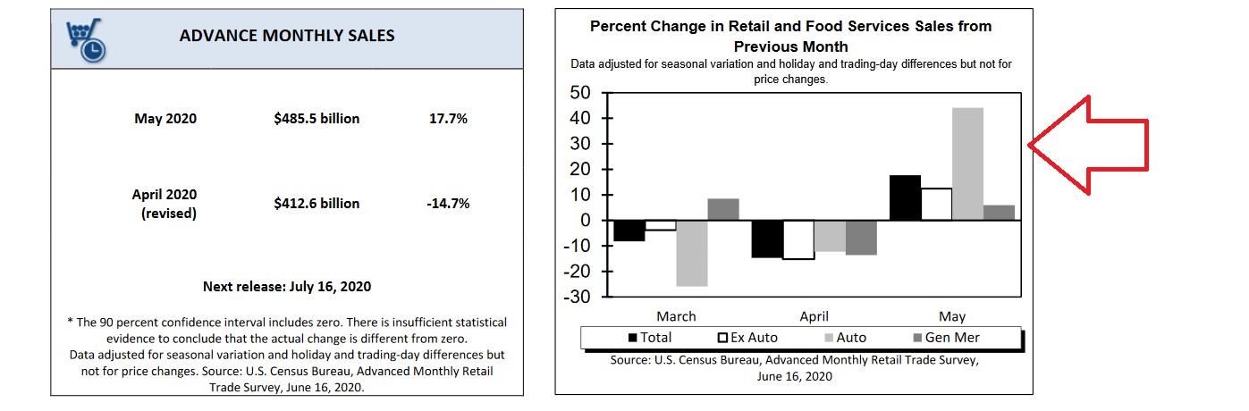“Advance estimates of U.S. retail and food services sales for May 2020 were $485.5 billion, an increase of 17.7% from the previous month, but 6.1% below May 2019. Total sales for the March 2020 through May 2020 period were down 10.5% from the same period a year ago. The March 2020 to April 2020 percent change was revised from down 16.4 percent to down 14.7%. Retail trade sales were up 16.8% from April 2020, but 1.4% below last year. Non-store retailers were up 30.8% from May 2019, while building material and garden equipment and supplies dealers were up 16.4% from last year.”
