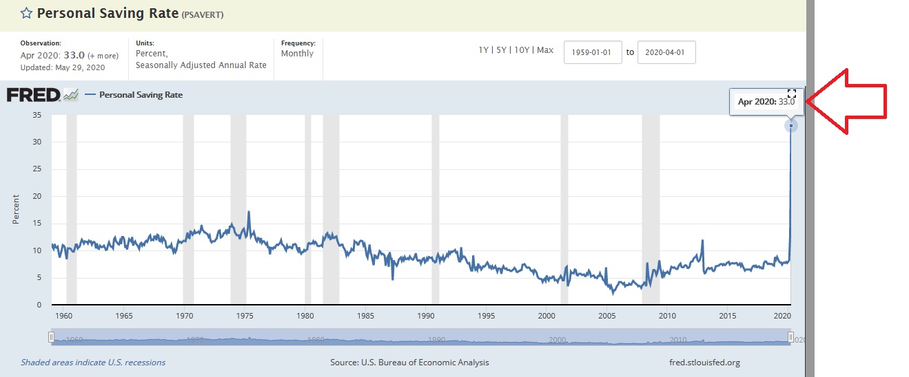 Personal savings is measured as a percentage of “disposable personal income,” or DPI. What is DPI? It’s the money a person retains after taxes and other mandatory withholdings are taken from a paycheck. In April, Americans saved 33% of their disposable income. The stimulus checks, as it turns out, have no withholding for taxes. In fact, this stimulus checks represent tax-free income. Neither state nor federal taxes need be paid. It is not considered taxable income. This fact most certainly helped boost the savings rate in April. It would appear Americans can save quite bit if they don’t have to pay taxes. 🙂