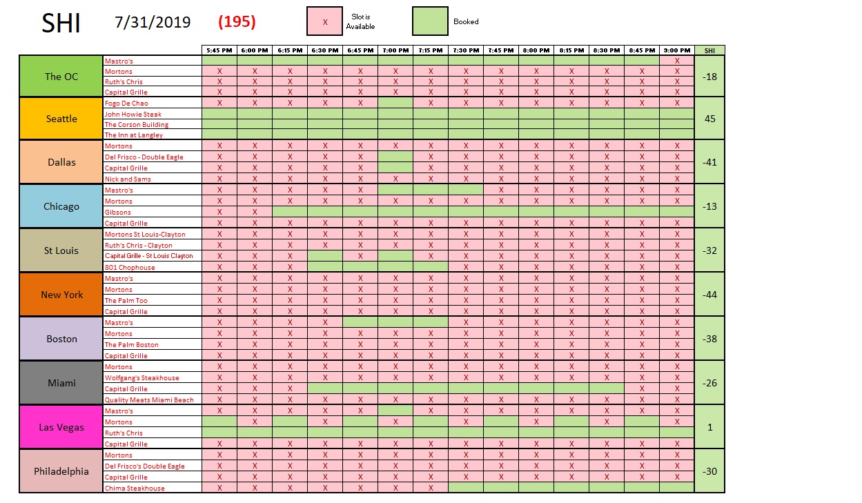 In general, most restaurants had similar table availability as last week. In fact, not much has changed for our expensive eateries for the past several weeks. Reservation demand has been fairly consistent, remaining on the weaker side of the ledger. Here are this weeks results: