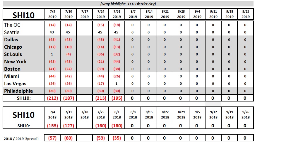 Not bad. This week the ‘spread’ between 2018 and 2019 has thinned. The SHI10 reading itself is more lukewarm than hot. Las Vegas made it into the ‘black’ this week: