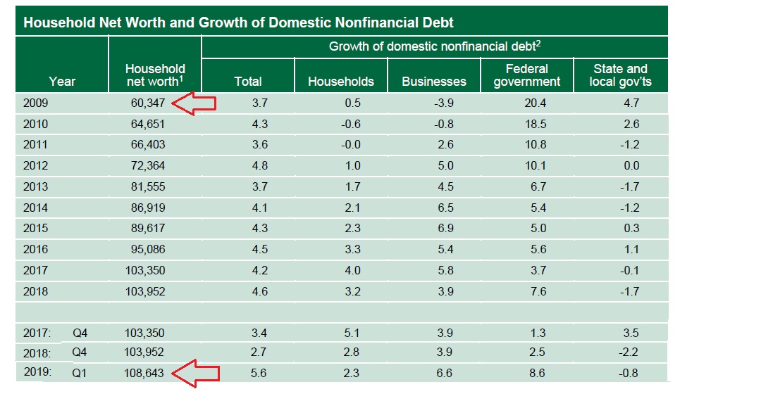 Note the two red arrows I’ve added. In 2009, as the Great Recession ended, US household net worth was about $60 trillion. At the beginning of 2019 — almost 10 years later — household net had almost doubled. This change is not confined to the US. In the 28 countries of the European Union, in the 4 years prior to Q4, 2018, household net worth increased by 22.6%, according to Eurostat.