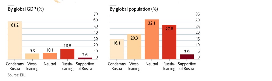 It appears that while only 1/3 of global populations either condemn Russia or “lean” toward western opinions, those populations make up more than 61% of global GDP. So that packs a bit more punch.