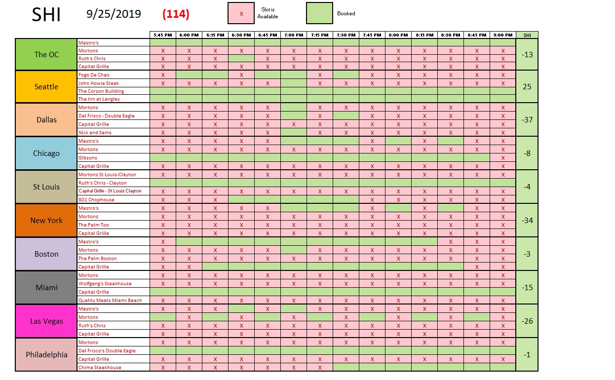 Here we get a clearer picture of this week’s reservation demand improvement.   The “spread” back on 9/4 was 168 points.   This week, at 83 points, the spread is much more aligned with the historic trend.   Piping hot NY strips are in demand, and the restaurants that serve the most expensive cuts are filling up this Saturday.