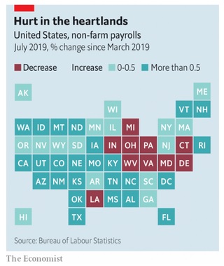 The bottom line:   The economic picture is spotty.   Some US industries — like construction — are still going gangbusters.  Others, take manufacturing for example, are not.   Geography seems to be playing a part too.   Take a look at this graphic, courtesy of The Economist magazine: