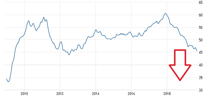 Part of the “rust belt” weakness is likely wreckage from the languishing trade war.   US manufacturing in this region has been hit hard; Europe, on the other hand, has been absolutely decimated.   This image, provided by TradingEconomics, shows the precipitous decline in ‘Euro Area’ manufacturing: