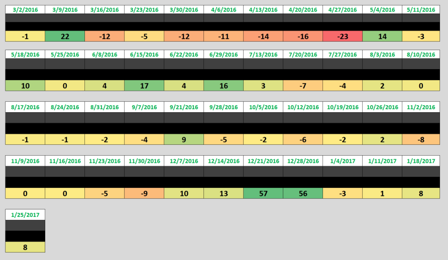 As mentioned above, this week’s reading is a positive 8.  The same as last week’s reading.   What might surprise you, however, is the data generating this reading: