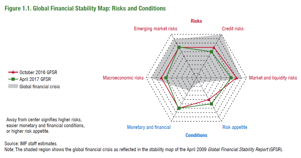 The “Great Recession” time-frame is represented by the darker gray area. As you can see the IMF believes monetary and financial conditions have improved measurably, and risks have subsided. So, in the aggregate, conditions are better and risks are smaller.