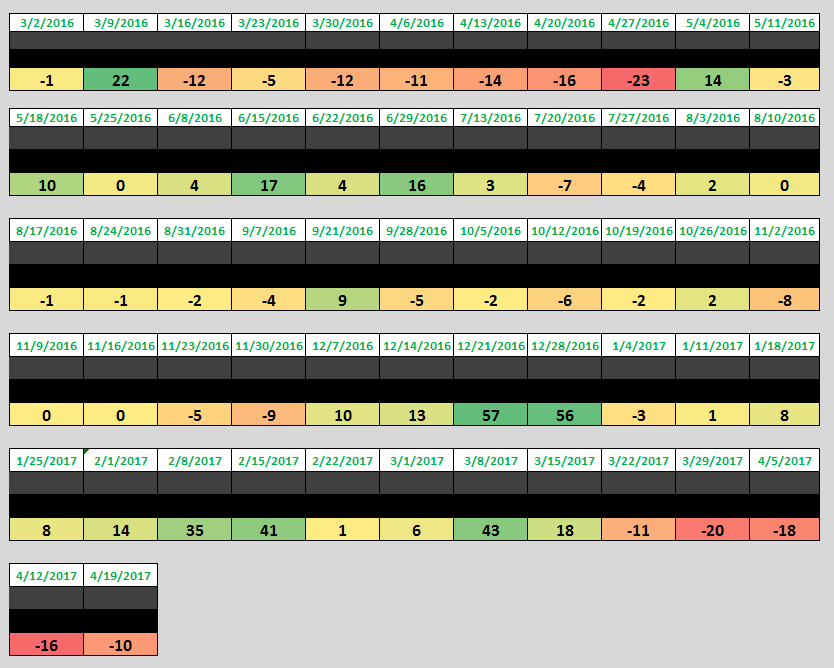 Once again, I’m sorry to report, the 4/19/17 SHI index is far less exciting than the prospect of dining at Mastros Ocean Club. This week, our SHI is a negative (-10). Very much in line with the reading from 4/20/16 of a negative (-16). Take a look:
