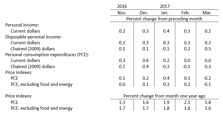 Inflation, measured by the PCE, declined slightly in March. And for the second month in a row, consumer spending – reflected by PCE – did not increase. This fact supports the weak Q1 GDP figures we saw last week. Remember, if consumer spending doesn’t increase, GDP growth will remain weak at best.