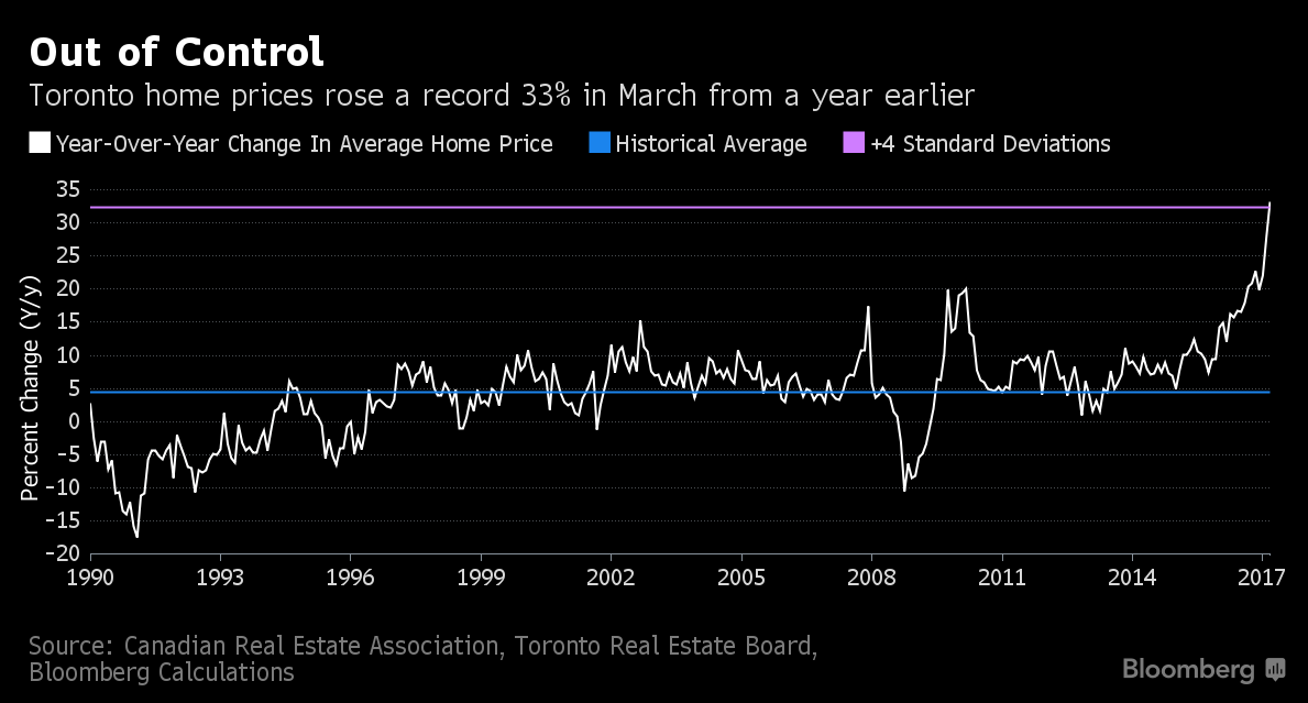 And the Canadian house market is on fire. While the ‘Home Capital’ stock price is down 66% since April 19th, Vancouver home prices are up 11% year-over-year, and condos are up over 17%. Clearly the Vancouver market remains buoyant, in spite of the BC 15 percent “foreign-buyer tax.” But this is nothing compared to Toronto: