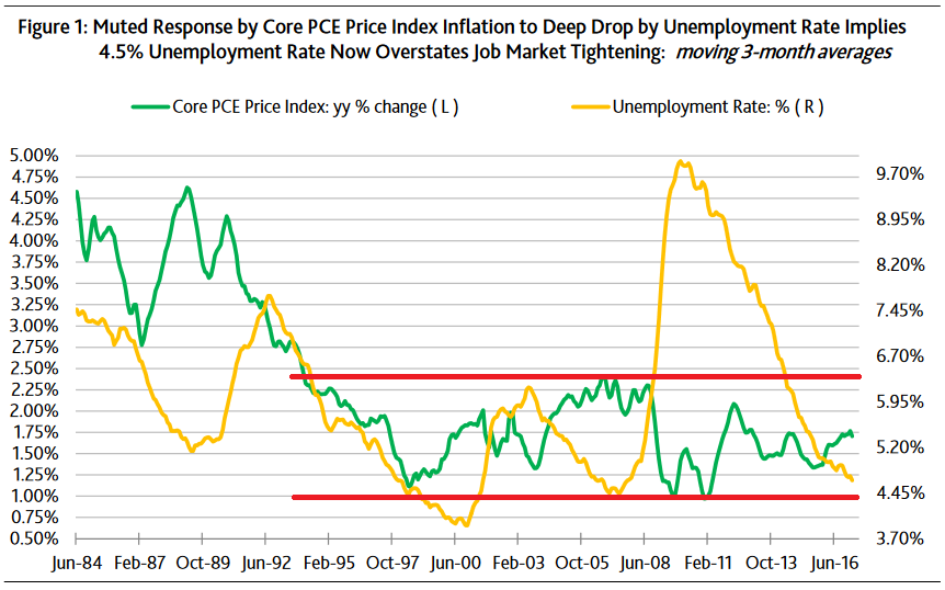 I added the two red lines.  The top of the range is about 2.4% and 1% at the bottom    Look at the green line:  Since the early 1990s, the core PCE inflation has remained within this range.   This relationship has held for 25 years.  For decades now, whether the unemployment rate was 10% or 4%, or somewhere in between, core PCE inflation has been range bound.