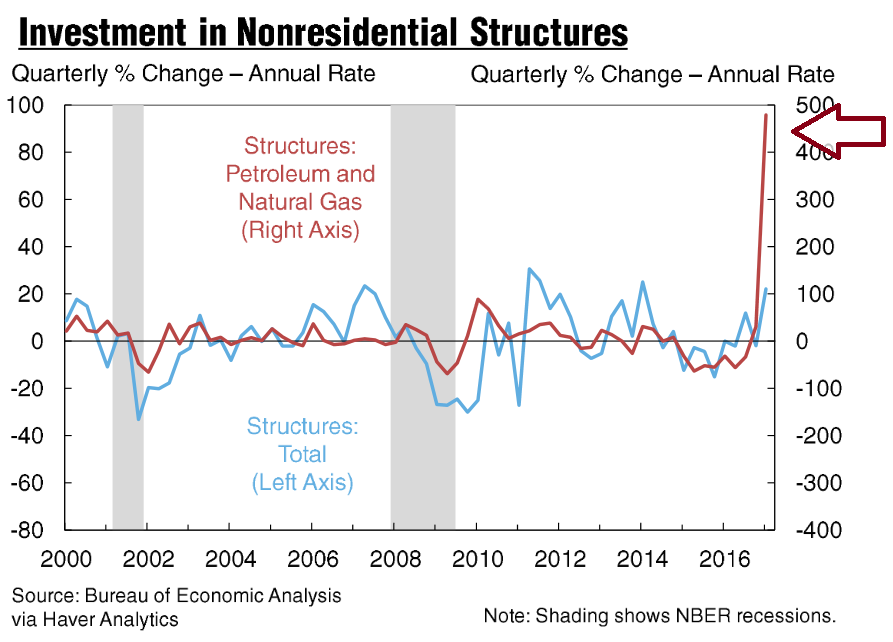 The red line shows changes in US investment in oil and gas structures over time. It’s pretty easy to see the massive spike in ‘new structures’ at the end of 2016.
