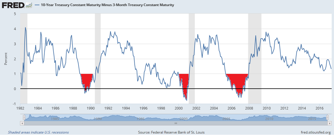First, I’ve modified the graphic a bit. I’ve added the red fill — from 1% and below — makes it a bit easier to see my point: Note that each of the three (3) prior recessions was preceded by a negative interest rate spread – meaning the 10-year Treasury was trading at a lower yield than the 3-month Treasury. In each case, months after the spread turned negative, the US economy entered a recession.